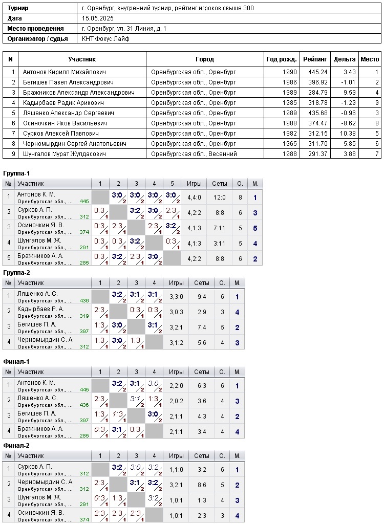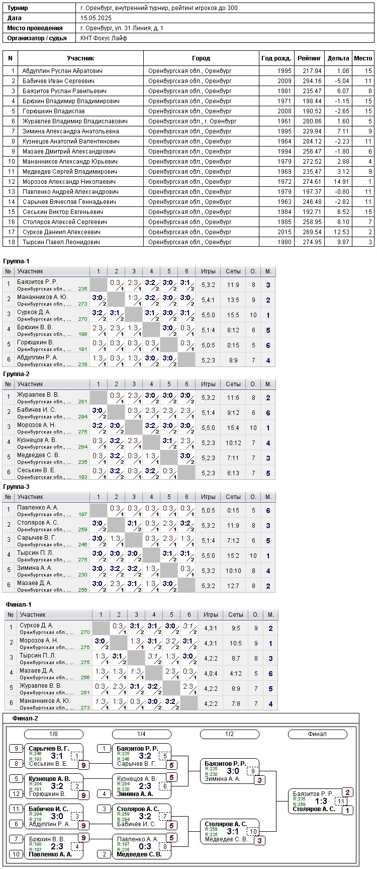 В турнире игроков, рейтинг свыше 300, приняли участие 9 спортсменов.