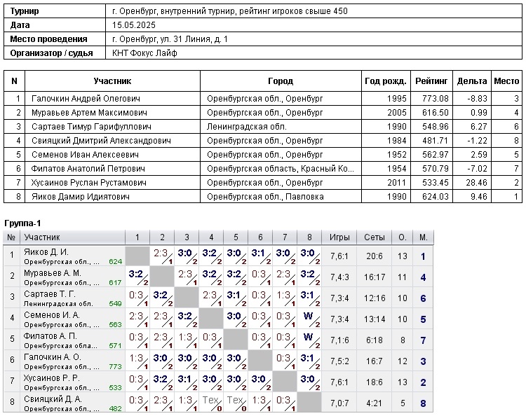 В турнире игроков, рейтинг свыше 450, приняли участие – 8 спортсменов.