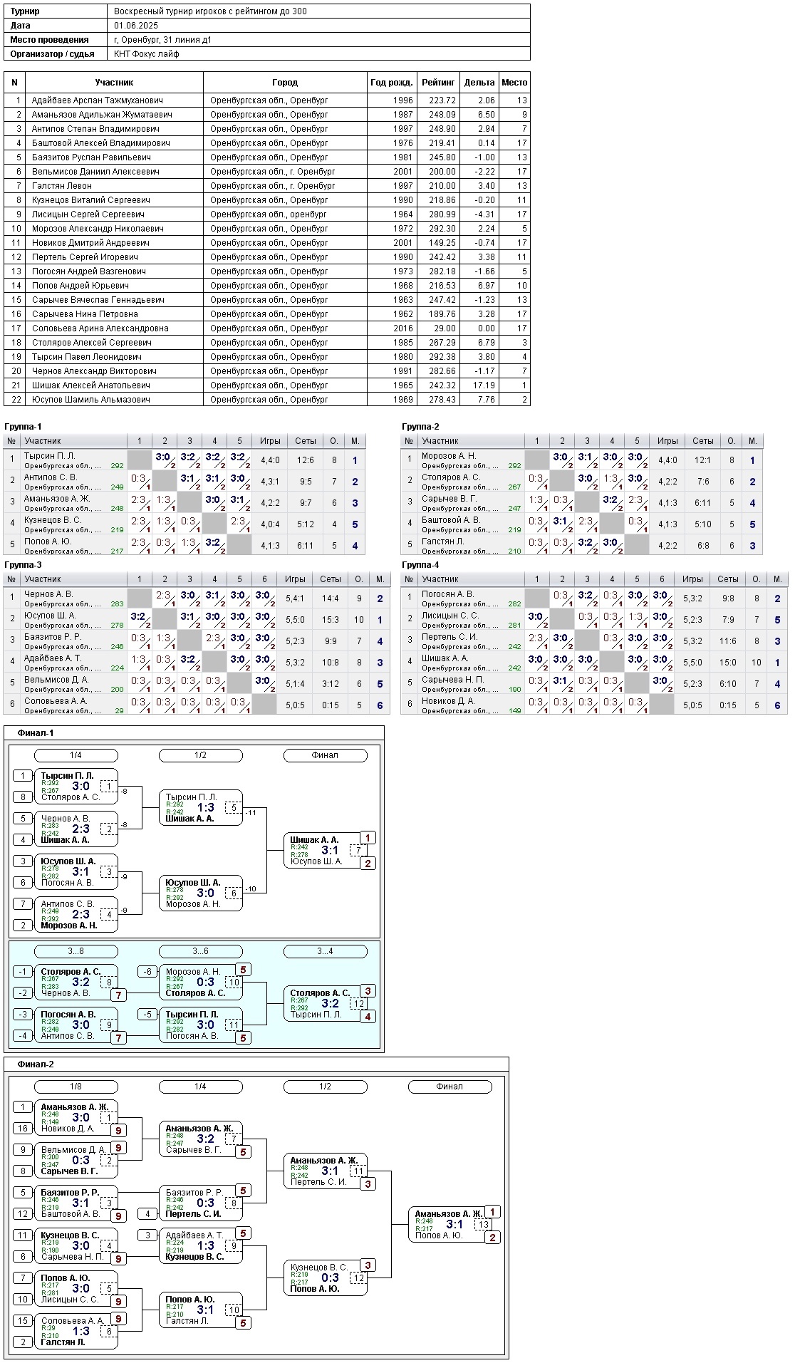 – в турнире игроков, рейтинг до 300, приняли участие 22 спортсмена