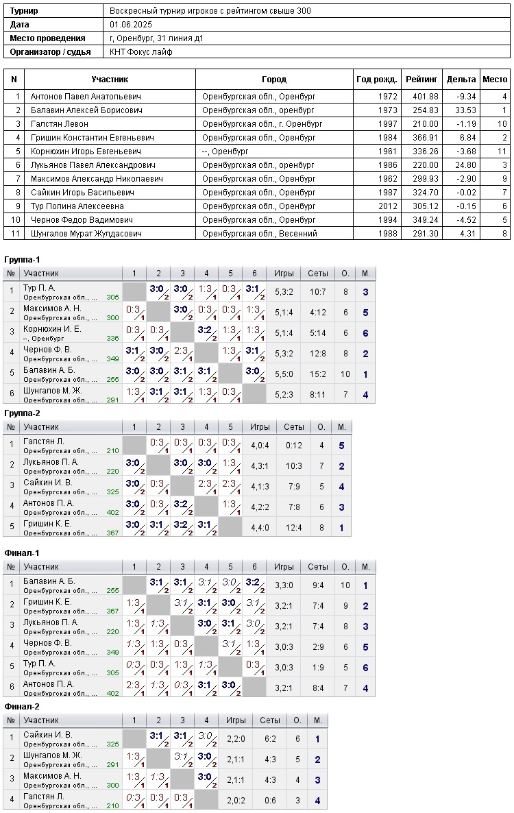 • в турнире игроков, рейтинг свыше 300, приняли участие 11 спортсменов.