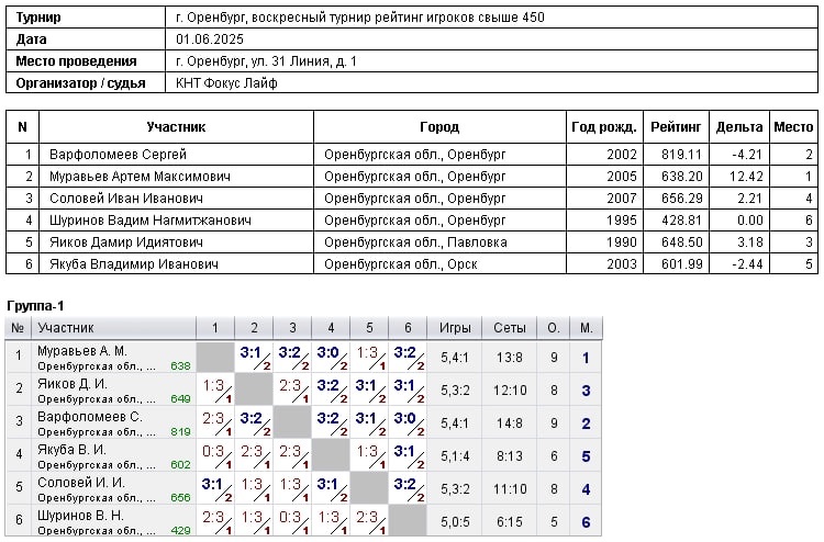 В турнире игроков, рейтинг свыше 450, приняли участие 6 спортсменов.