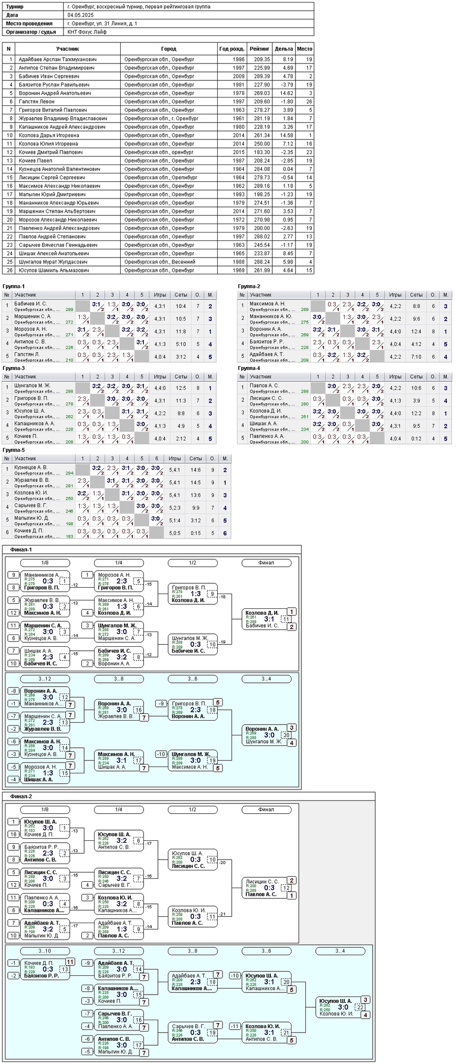 – в турнире игроков, рейтинг до 300, приняли участие 26 спортсменов.