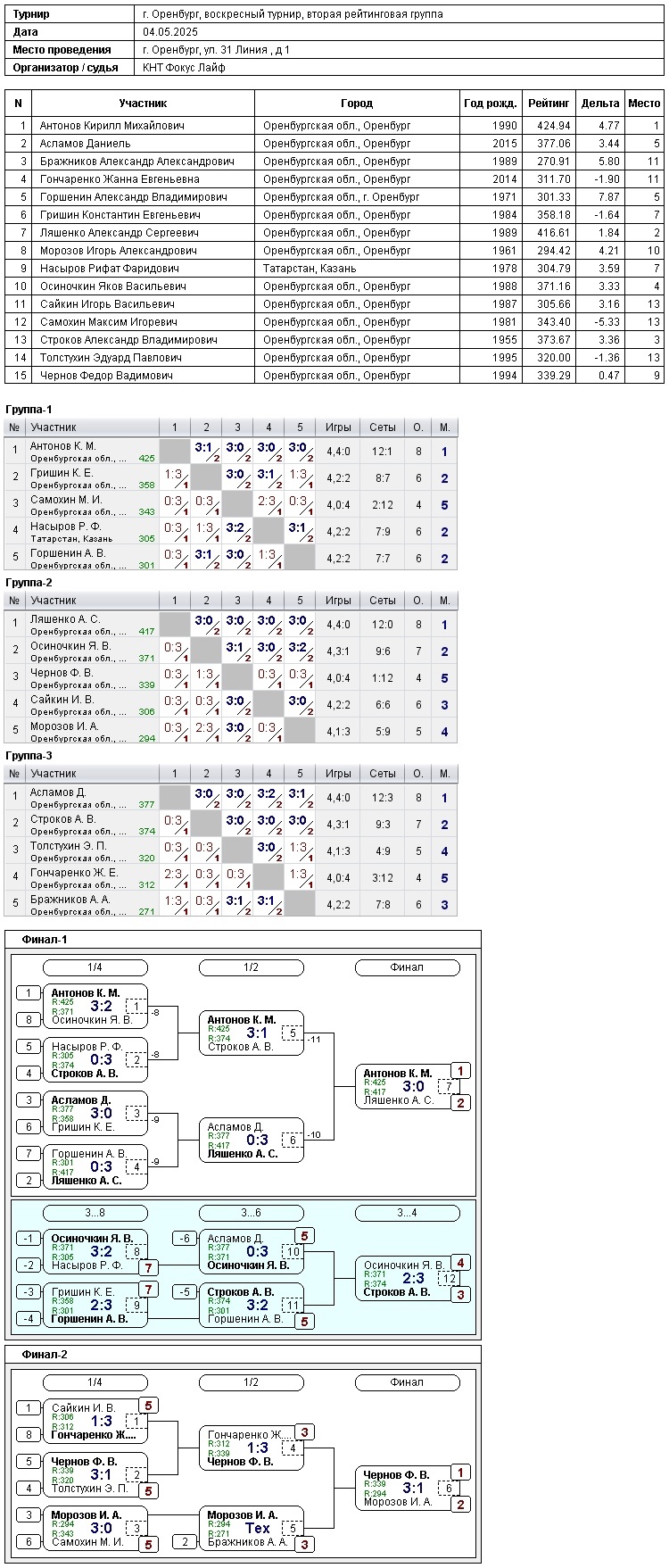 в турнире игроков, рейтинг свыше 300, приняли участие 15 спортсменов.