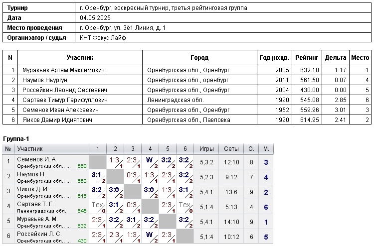 В турнире игроков, рейтинг свыше 450, приняли участие 6 спортсменов.