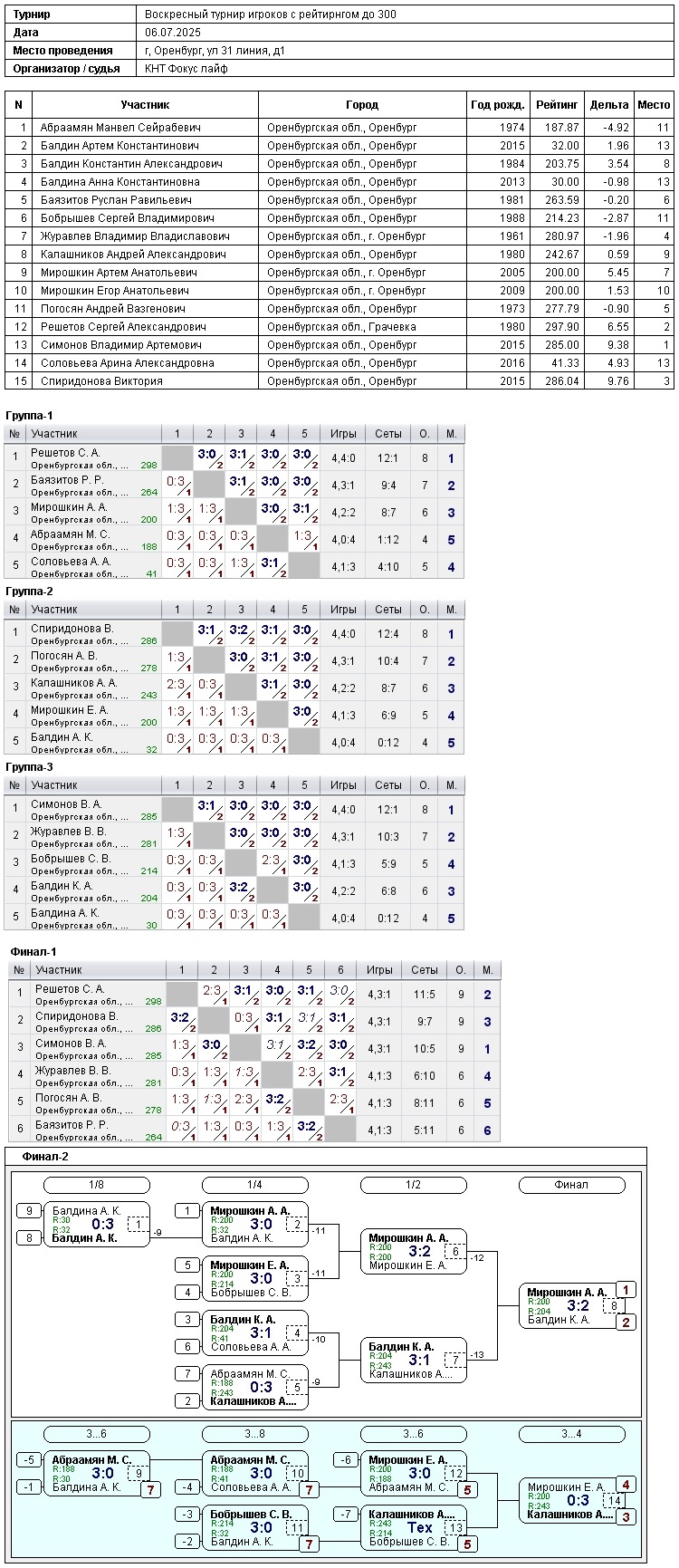 – в турнире игроков, рейтинг до 300, приняли участие 15 спортсменов