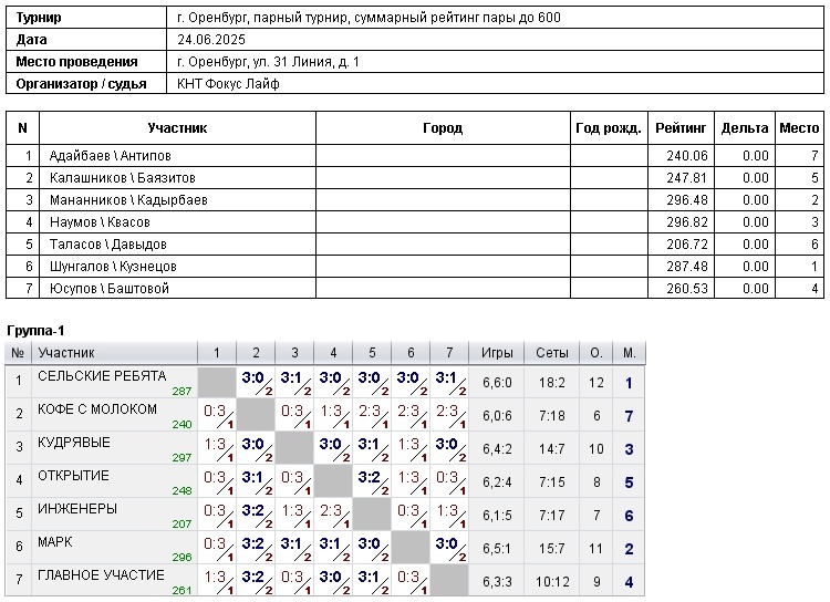 Парный турнир “Фокус Лайф” (суммарный рейтинг пары до 600) 24.06.2025