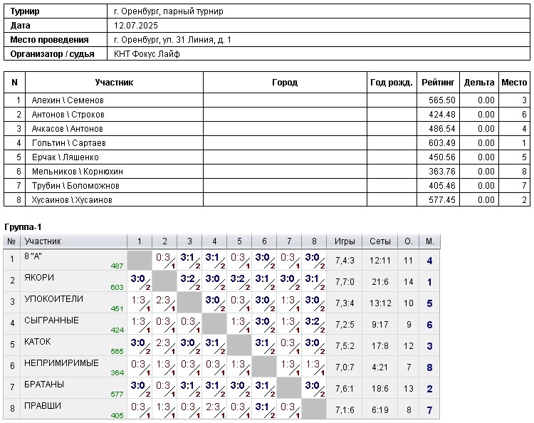 В КНТ Фокус Лайф завершился субботний парный турнир. Сегодня приняли участие 8 команд: