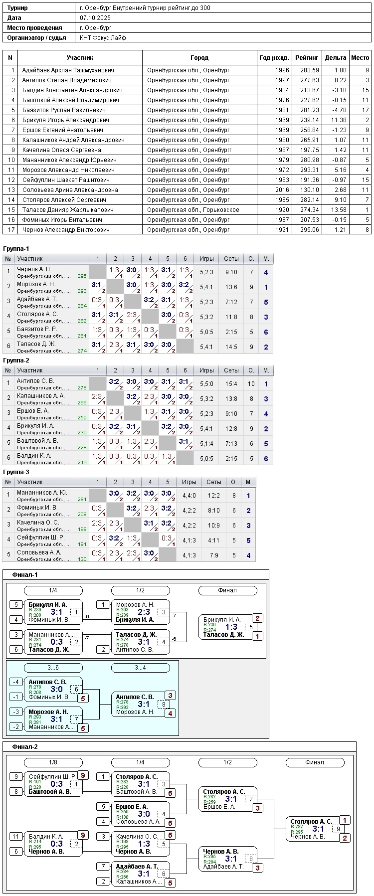 В КНТ Фокус Лайф завершился внутренний турнир игроков, рейтинг до 300, в котором приняли участие 17 спортсменов. Победителями стали:1 – Таласов Данияр;2 – Брикуля Игорь;3 – Антипов Степан Поздравляем победителей!!!