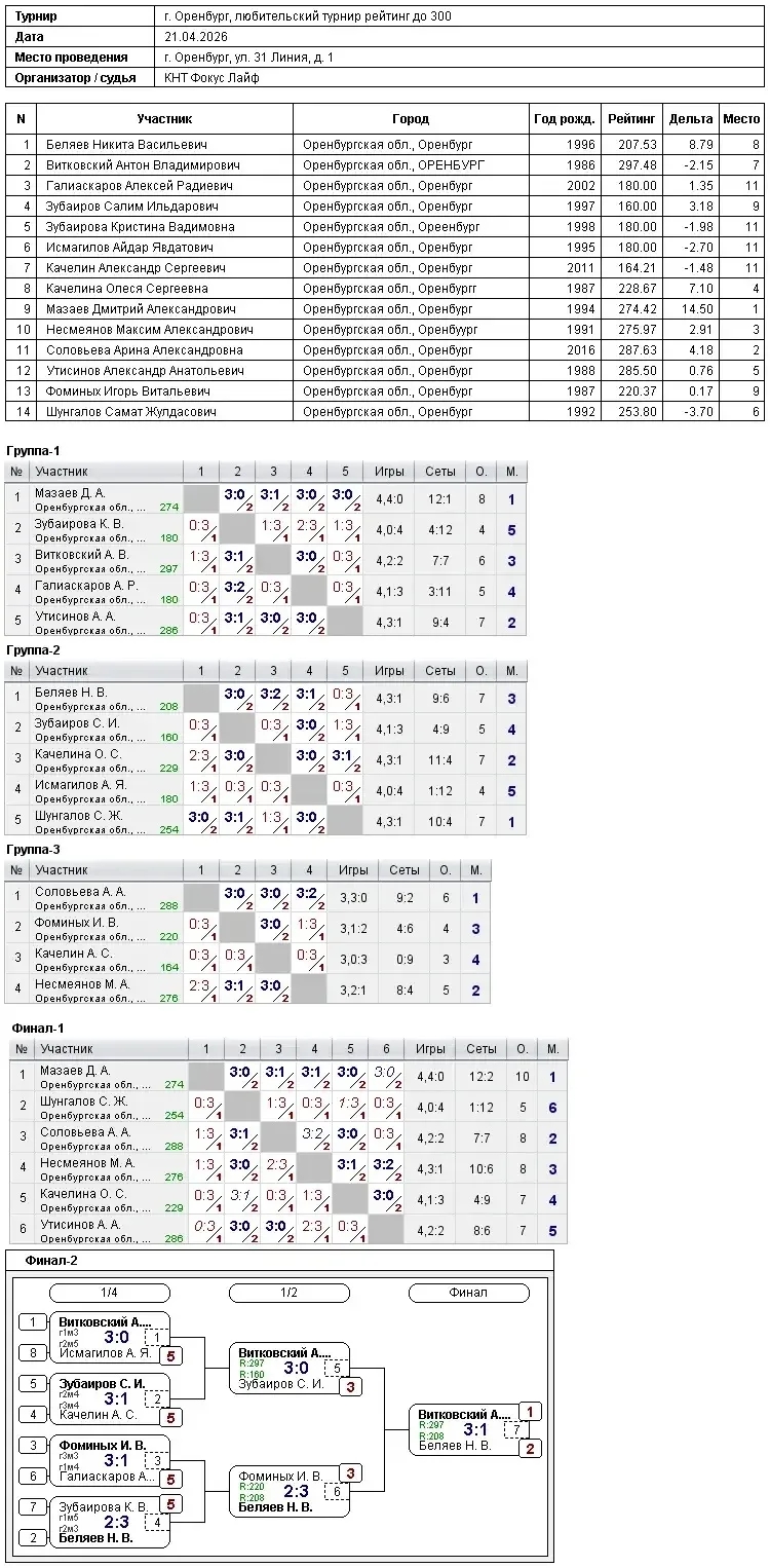 В КНТ Фокус Лайф завершился любительский турнир, рейтинг игроков до 300, приняли участие 14 спортсменов.Победителями стали:1 – Мазаев Дмитрий;2 – Соловьёва Арина;3 – Несмеянов МаксимПоздравляем победителей!!!