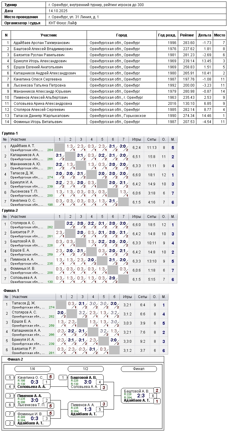 Внутренний турнир рейтинг до 300 TTW КНТ Фокус Лайф 14.10.2025