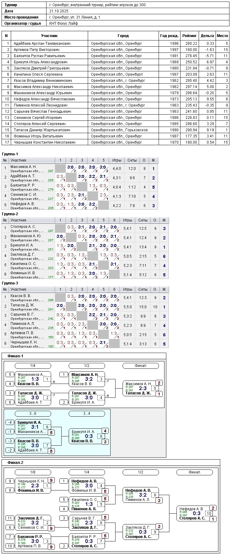 Внутренний турнир рейтинг до 300 TTW КНТ Фокус Лайф 21.10.2025