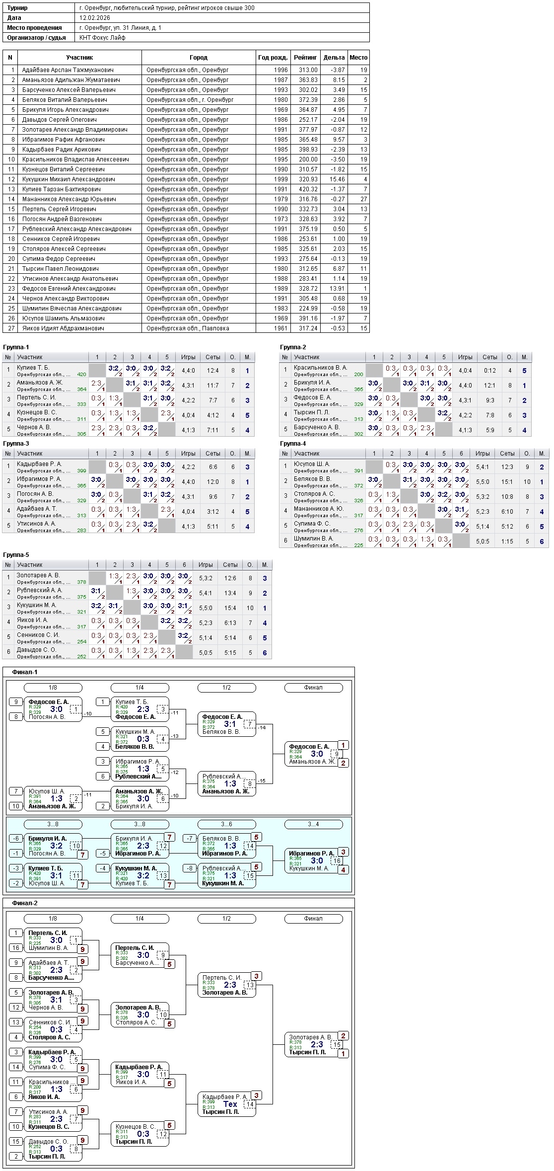 Сегодня в турнире игроков, рейтинг свыше 300, приняли участие 27 спортсменов