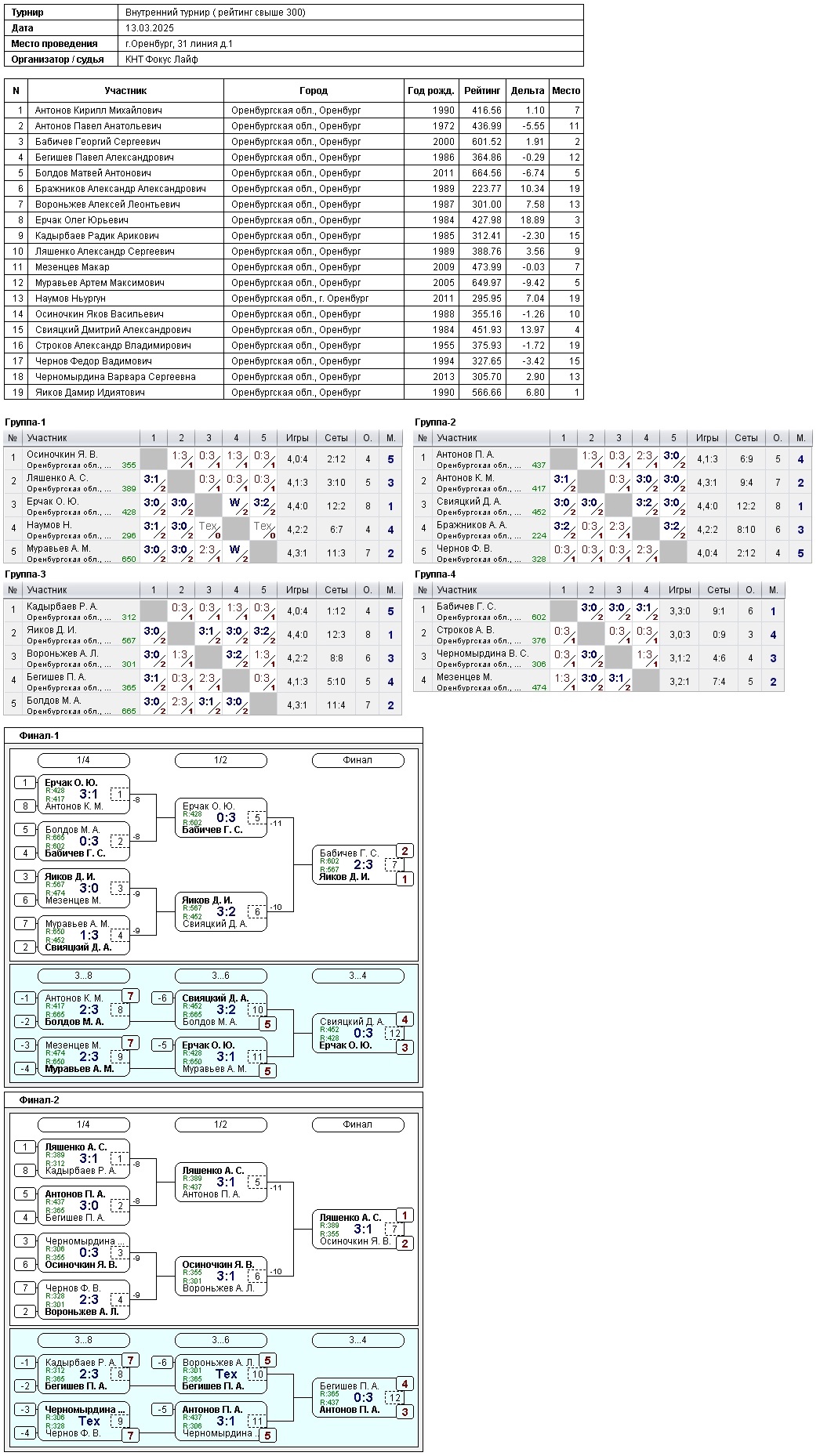 В турнире игроков с рейтингом свыше 300 приняли участие 19 спортсменов.