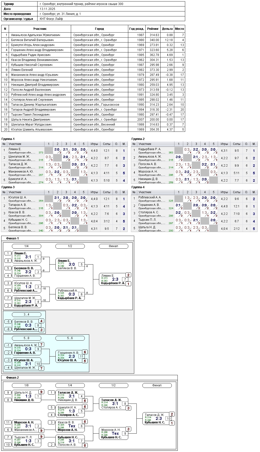 Сегодня в турнире игроков, рейтинг свыше 300, приняли участие 20 спортсменов.