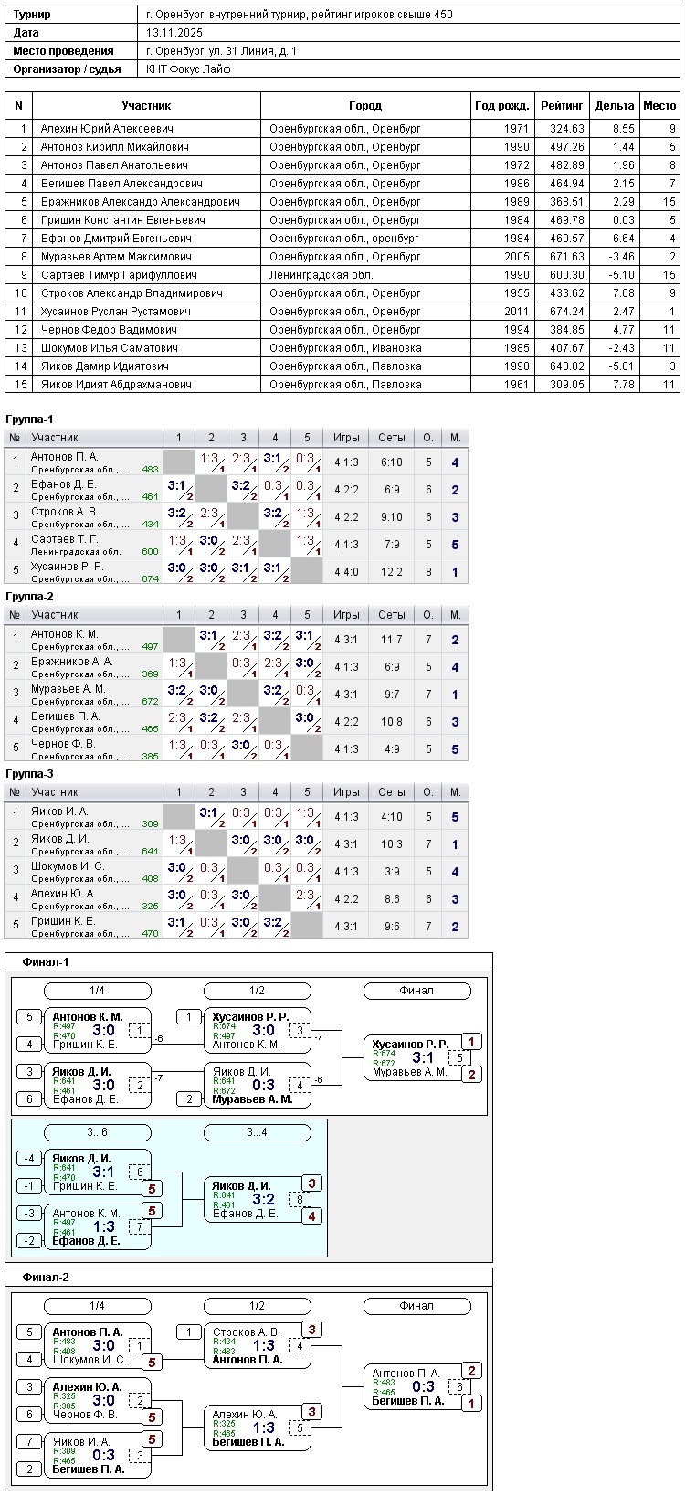 В турнире игроков, рейтинг свыше 450, приняли участие 15 спортсменов.