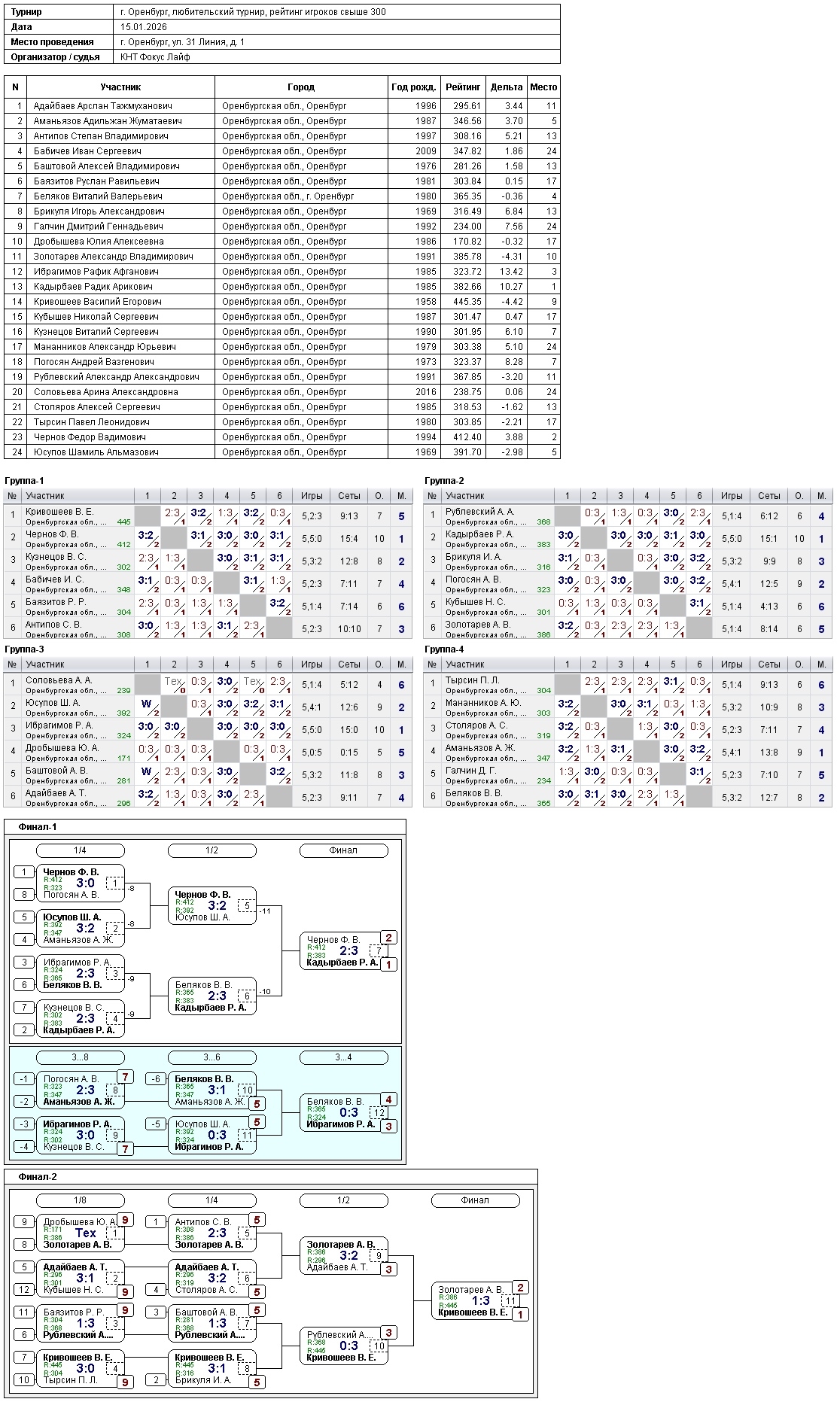 Сегодня в турнире игроков, рейтинг свыше 300, приняли участие 24 спортсмена.