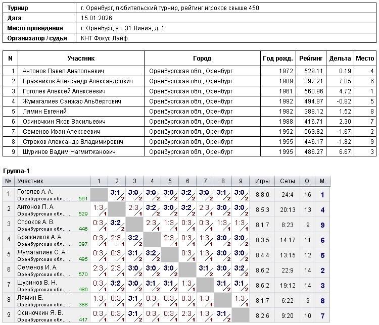 В турнире игроков, рейтинг свыше 450, приняли участие 9 спортсменов.