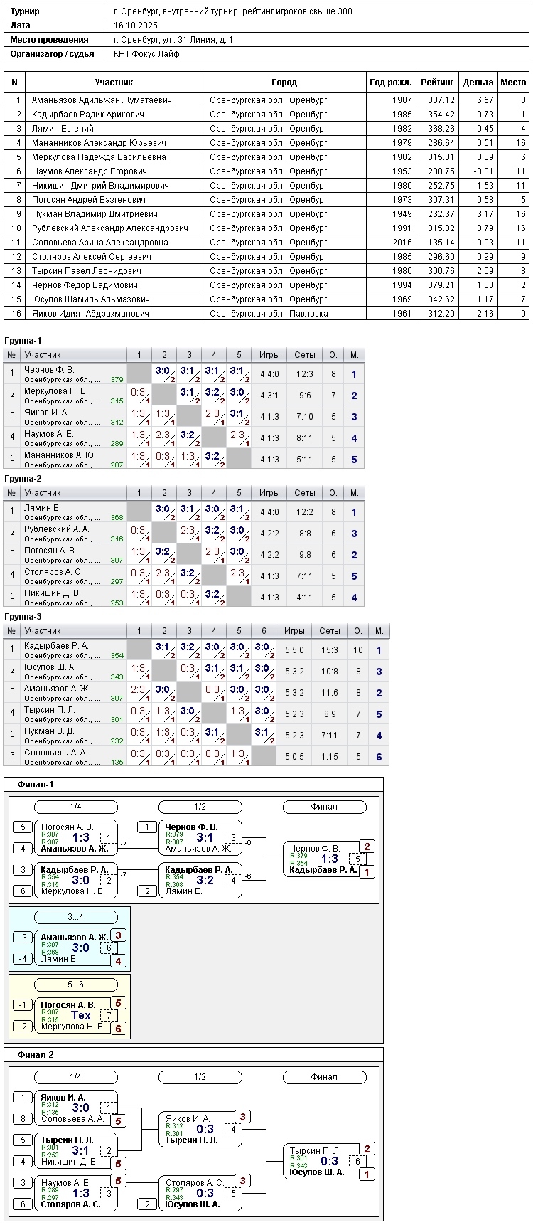 В турнире игроков, рейтинг свыше 300, приняли участие 16 спортсменов.