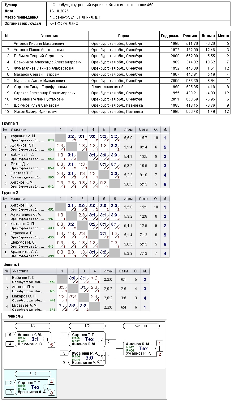 В турнире игроков, рейтинг свыше 450, приняли участие 12 спортсменов.