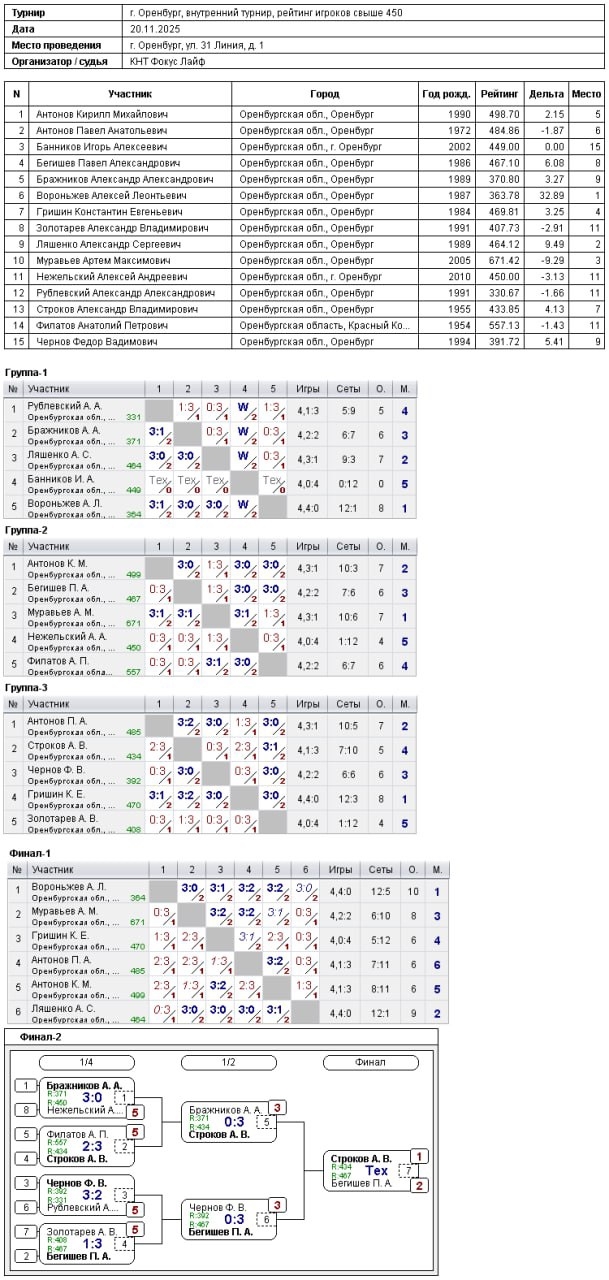 В турнире игроков, рейтинг свыше 450, приняли участие 15 спортсменов.