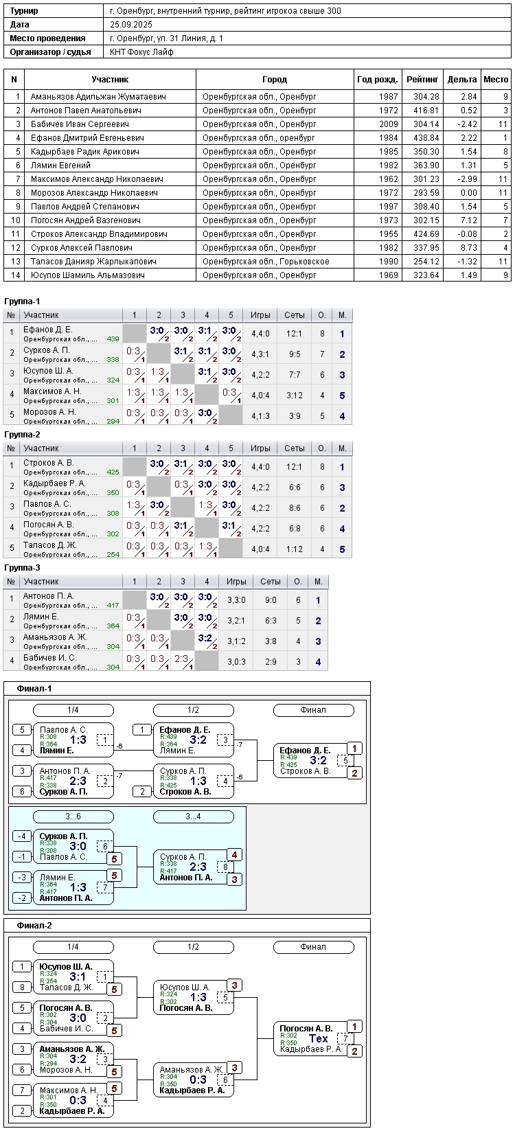В турнире игроков, рейтинг свыше 300, приняли участие 14 спортсменов.