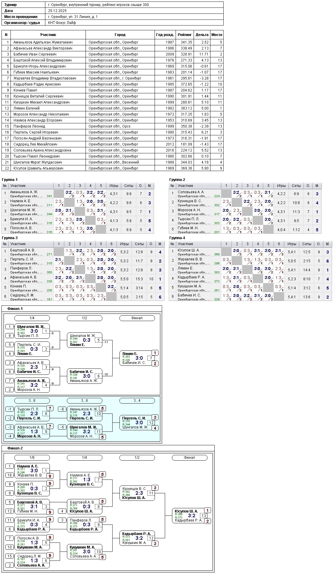 Сегодня в турнире игроков, рейтинг свыше 300, приняли участие 22 спортсмена.