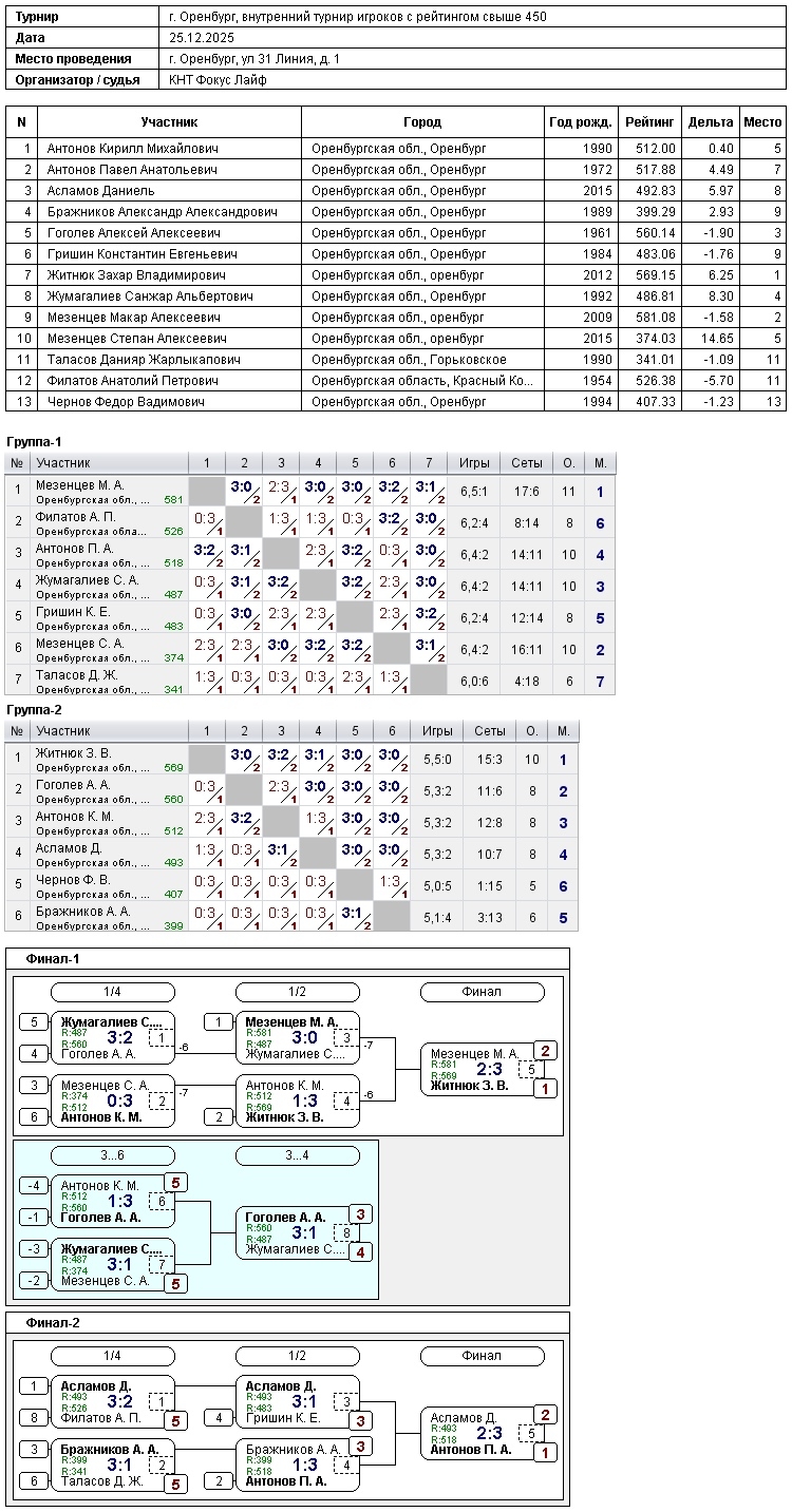 В турнире игроков, рейтинг свыше 450, приняли участие 13 спортсмена.