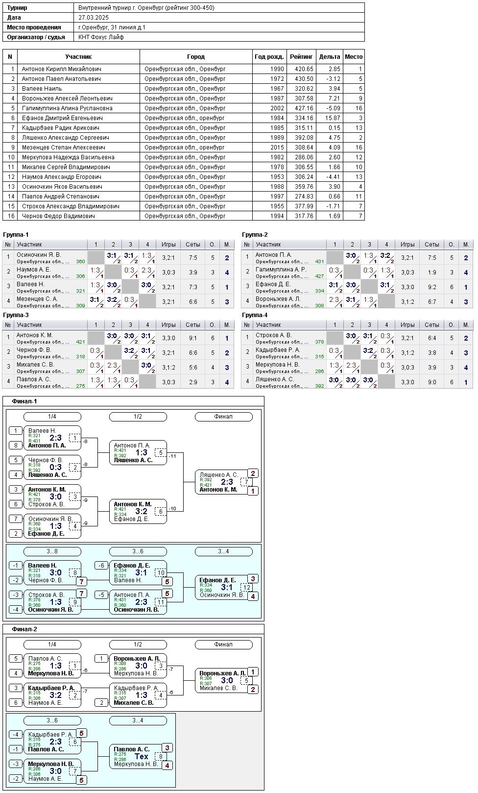 В турнире игроков, рейтинг свыше 300, приняли участие 16 спортсменов.