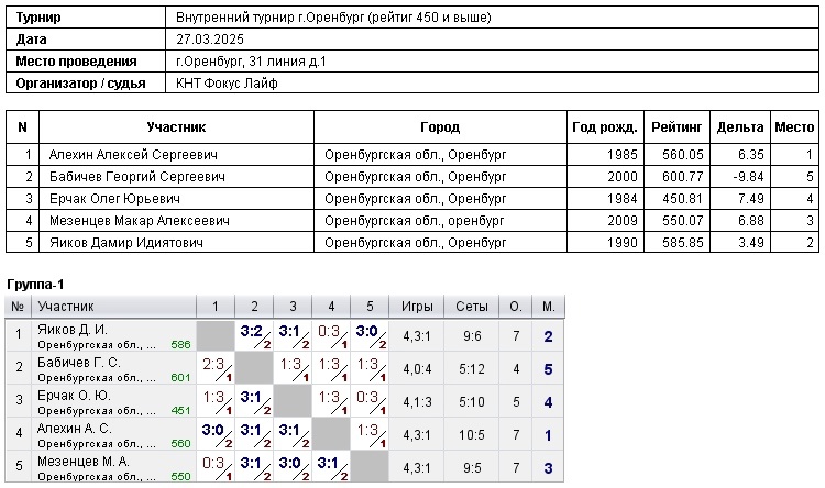 В турнире игроков, рейтинг свыше 450, приняли участие 5 спортсменов. Победителями стали: