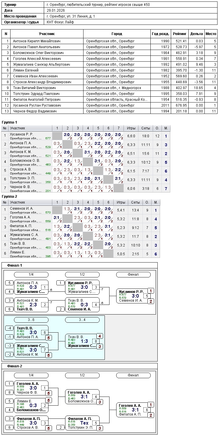 В турнире игроков, рейтинг свыше 450, приняли участие 13 спортсменов.