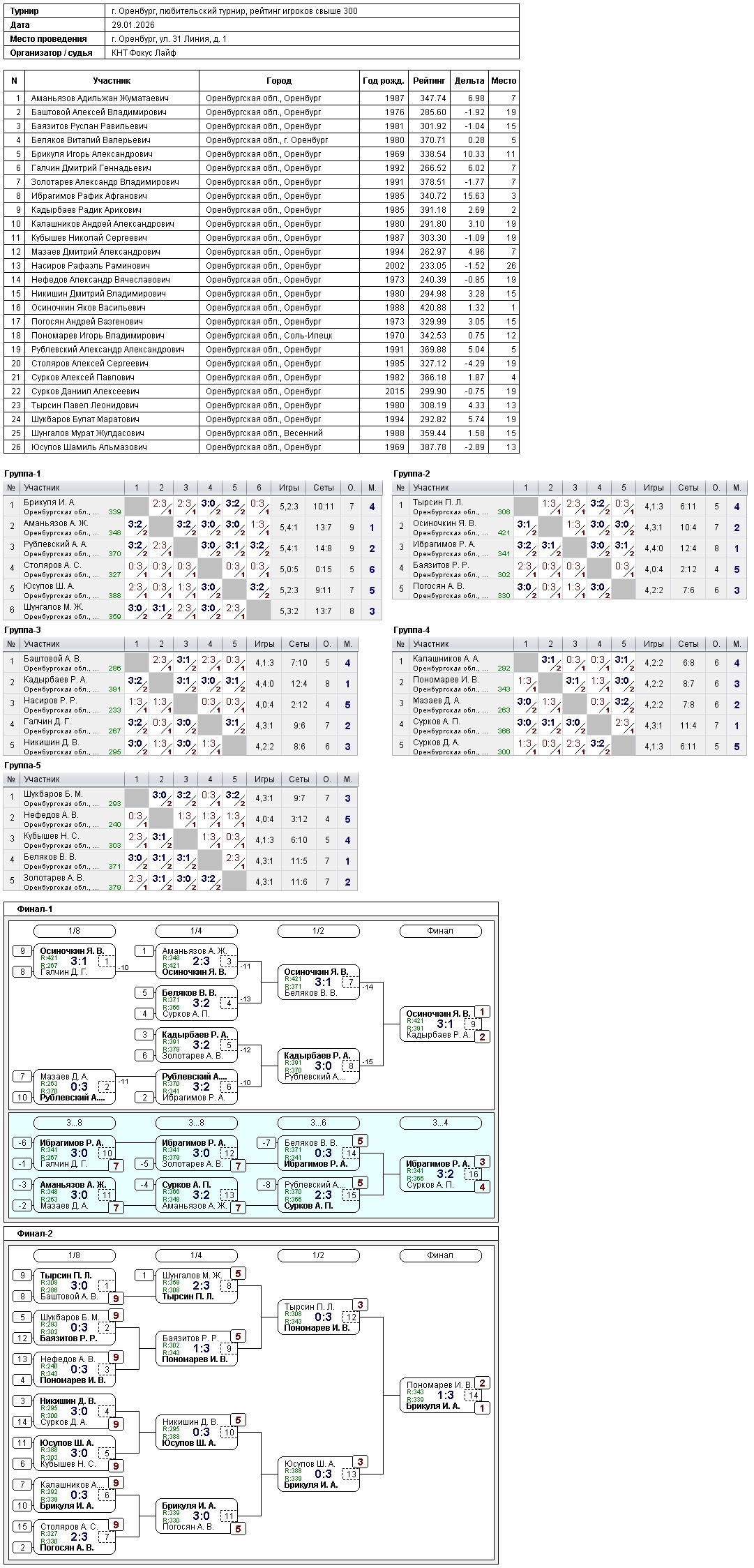 Сегодня в турнире игроков, рейтинг свыше 300, приняли участие 26 спортсменов.