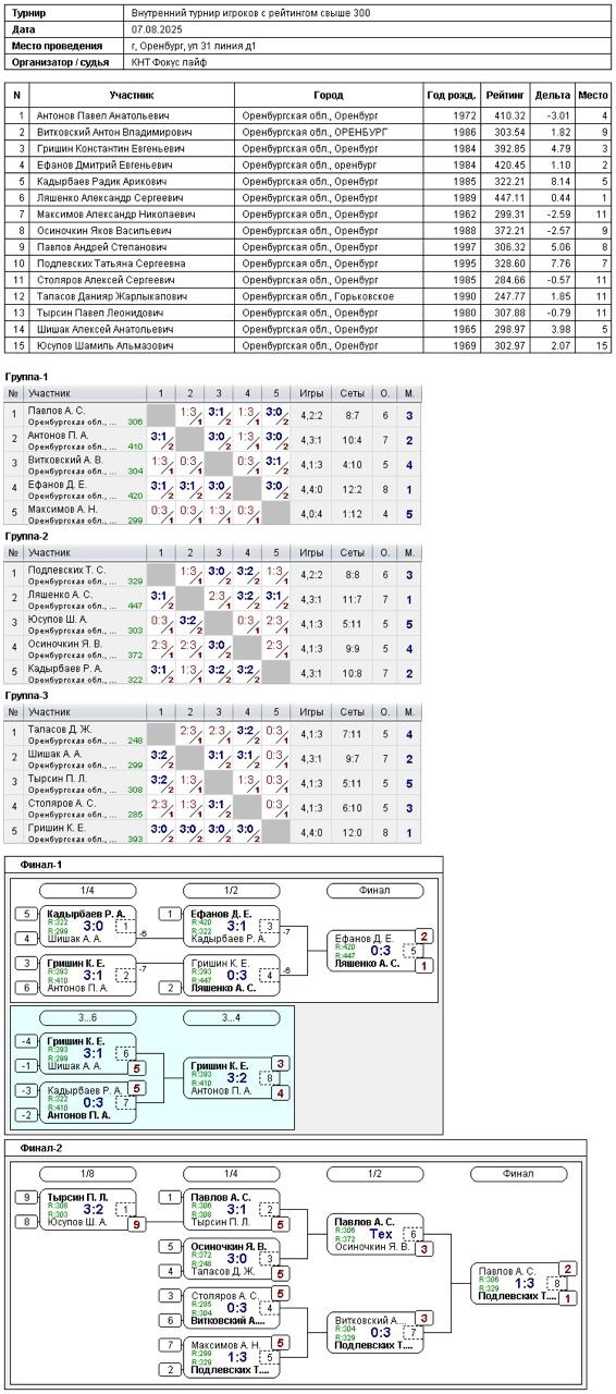 В турнире игроков, рейтинг свыше 300, приняли участие 15 спортсменов.