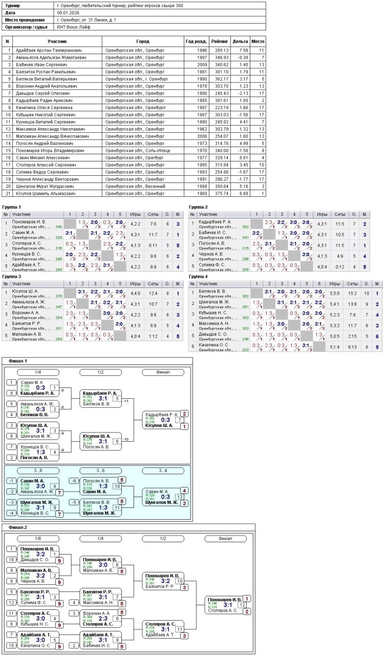 Сегодня в турнире игроков, рейтинг свыше 300, приняли участие 21 спортсмен. Победителями стали: