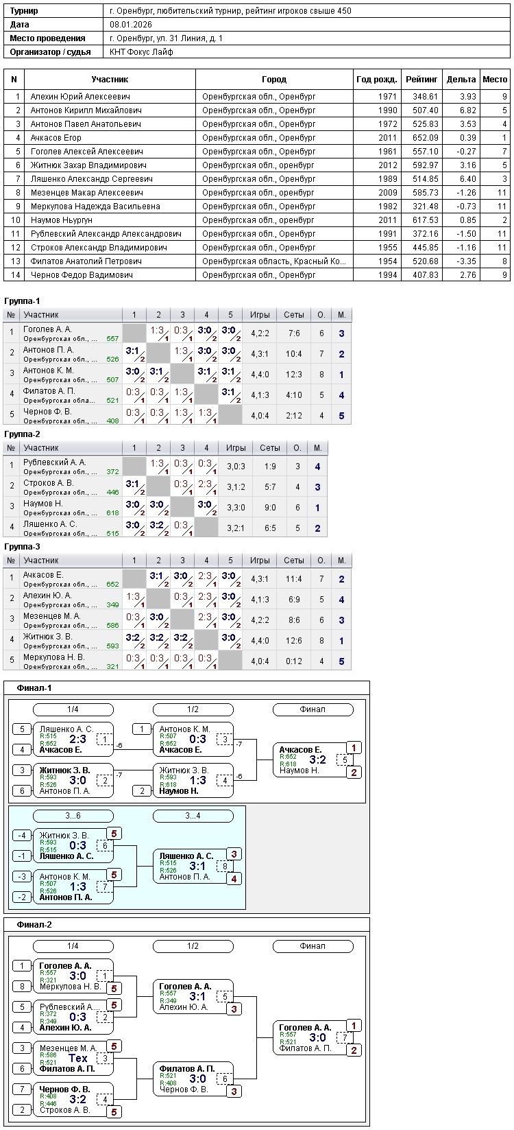 3 – Шунгалов Мурат В турнире игроков, рейтинг свыше 450, приняли участие 14 спортсмена. Победителями стали: