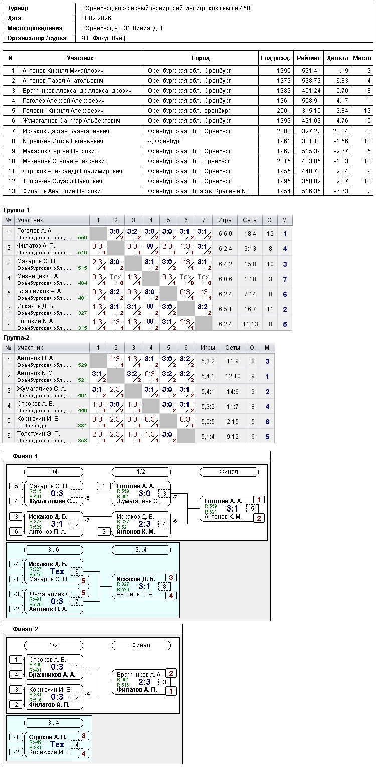 В турнире игроков, рейтинг свыше 450, приняли участие – 13 спортсменов.
