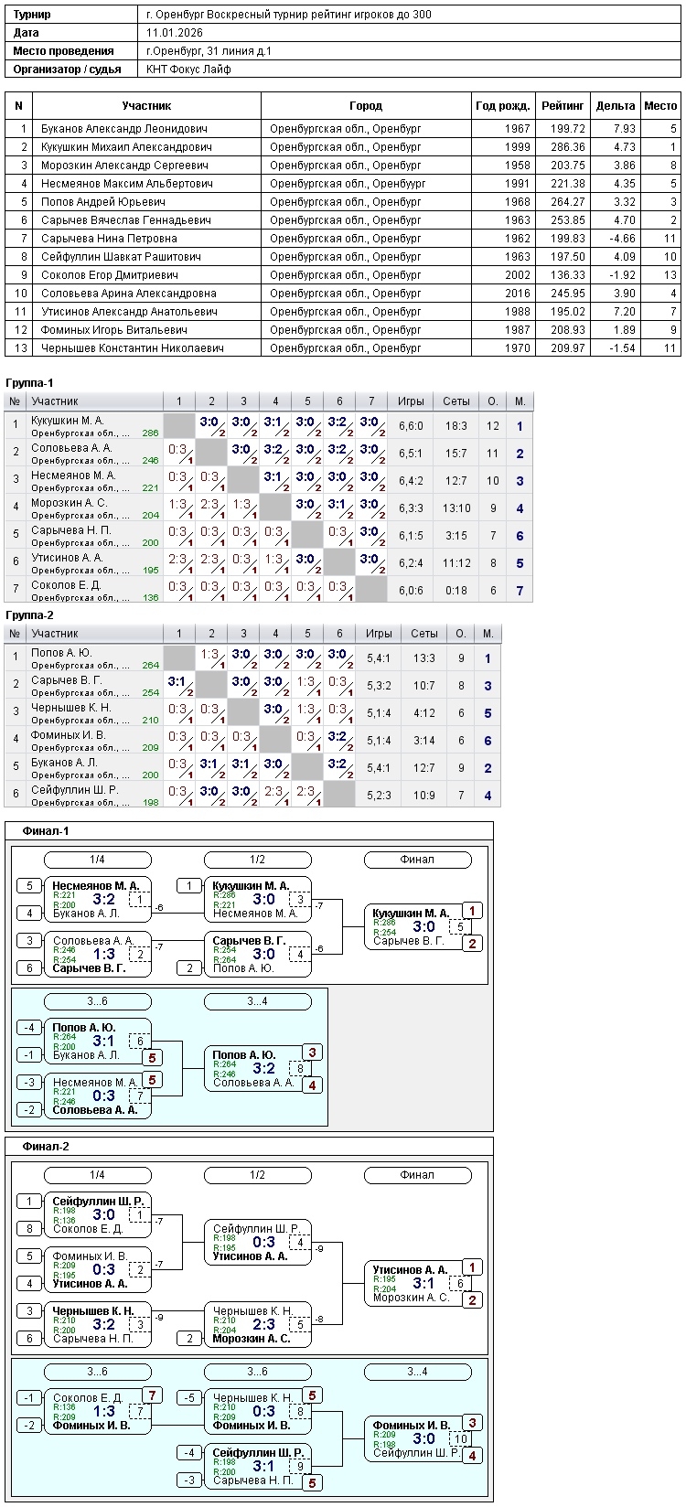 Сегодня в турнире игроков, рейтинг до 300, приняли участие 13 спортсменов.