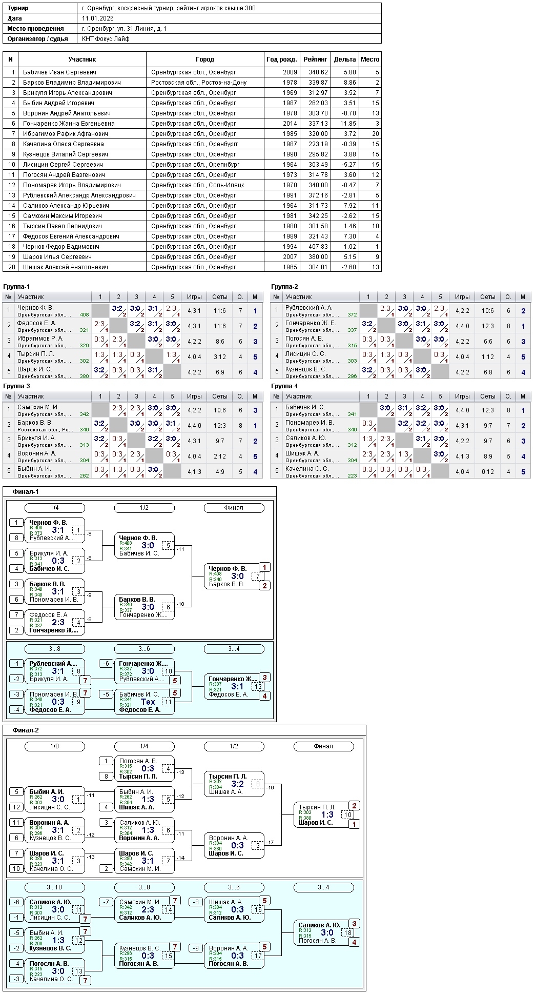 В турнире игроков, рейтинг свыше 300, приняли участие 20 спортсменов.