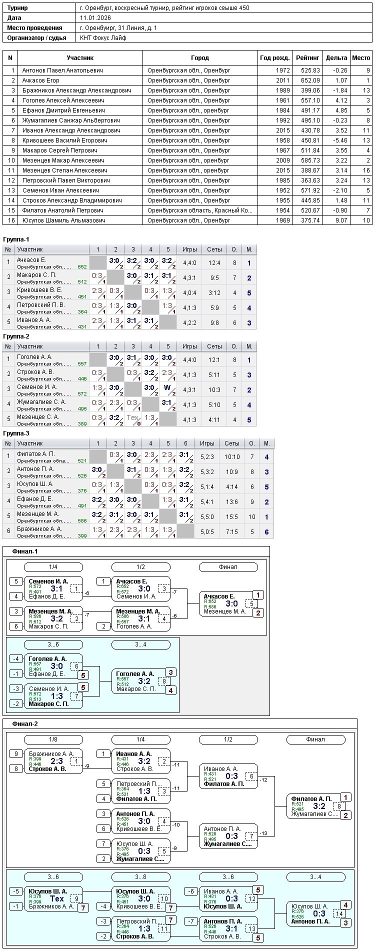 В турнире игроков, рейтинг свыше 450, приняли участие – 16 спортсменов.