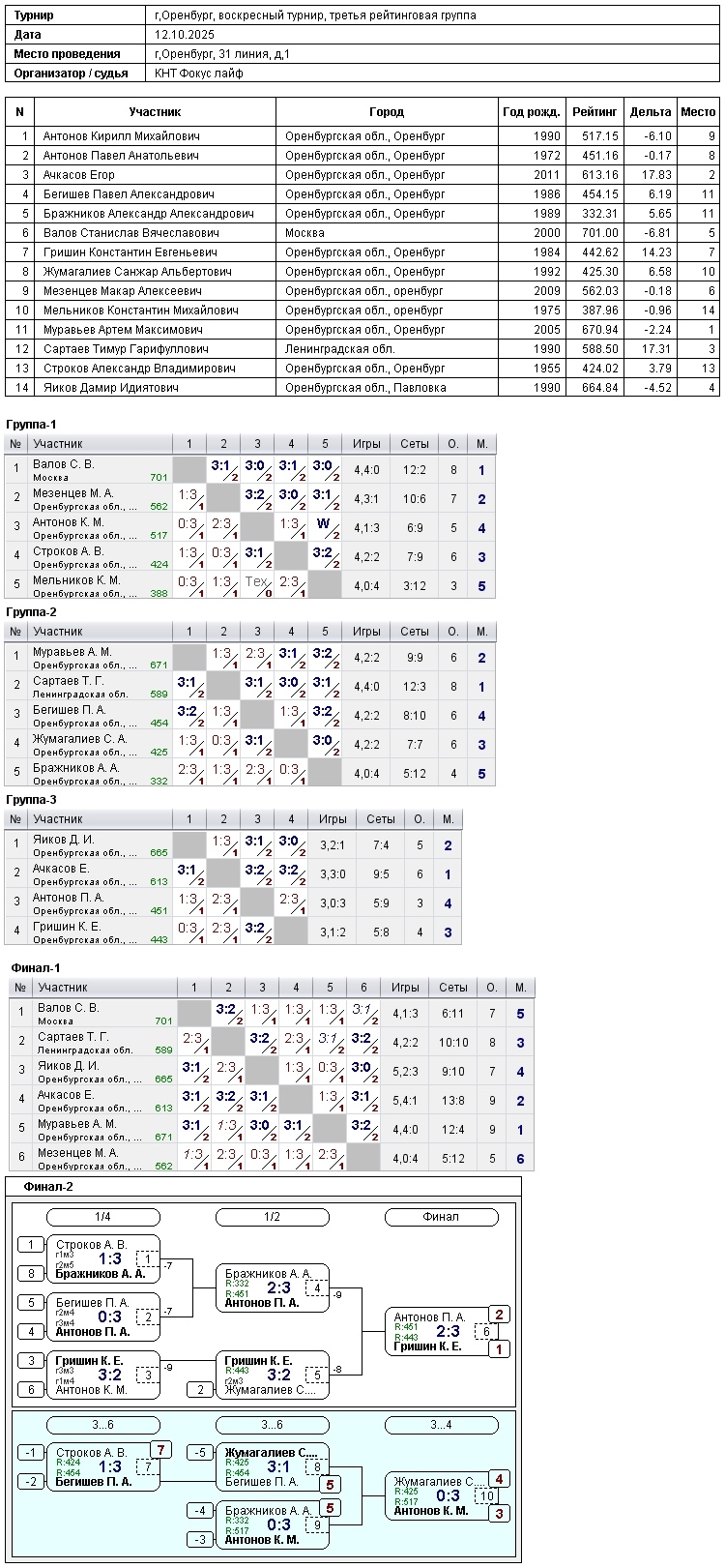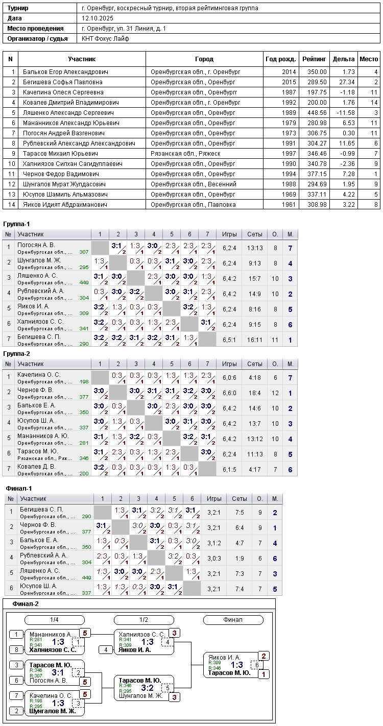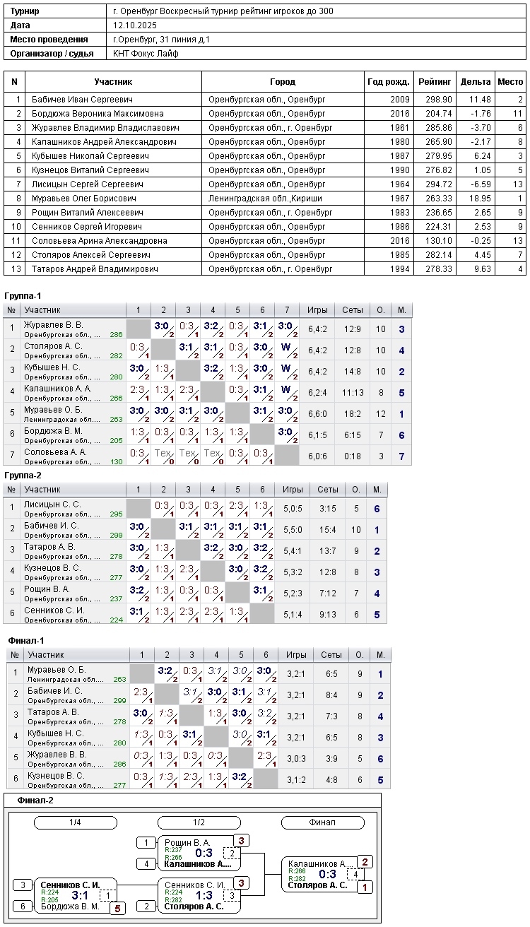 В турнире игроков, рейтинг свыше 300, приняли участие 14 спортсменов.