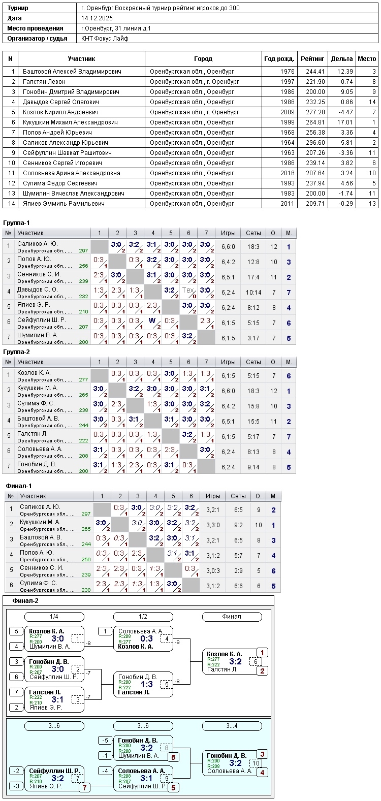 Сегодня в турнире игроков, рейтинг до 300, приняли участие 14 спортсменов Победителями стали: