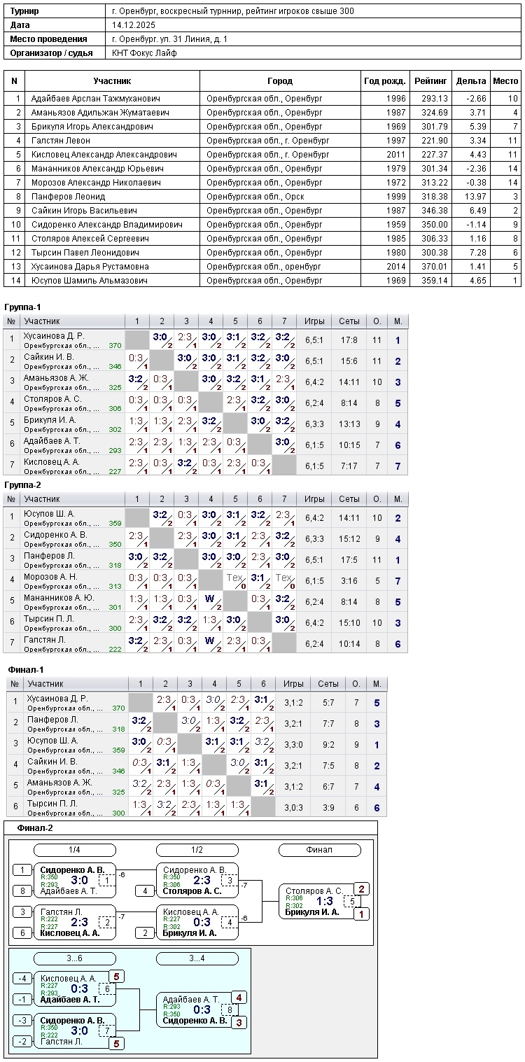 Сегодня в турнире игроков, рейтинг до 300, приняли участие 14 спортсменов