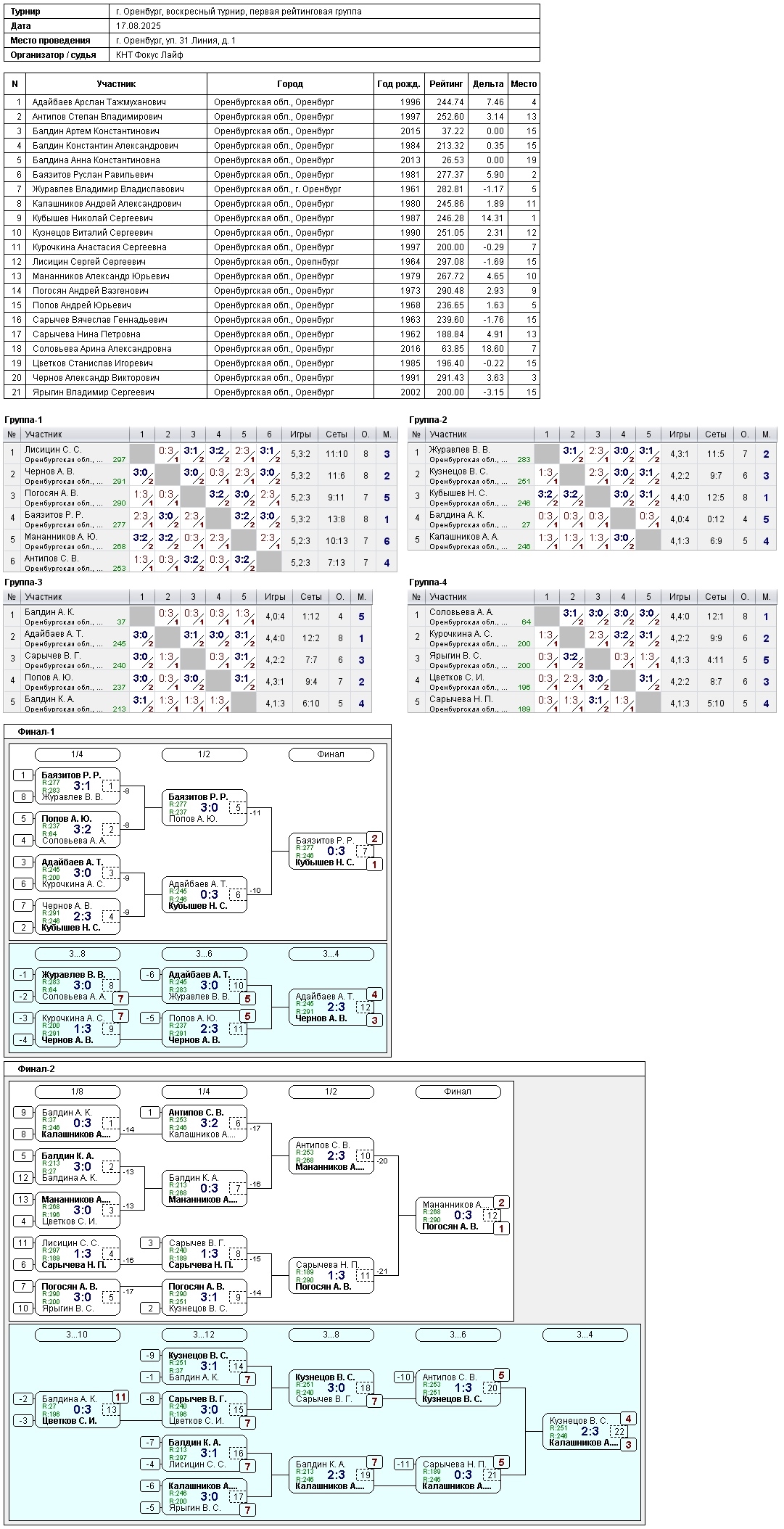 Сегодня в турнире игроков, рейтинг до 300, приняли участие 21 спортсмен.