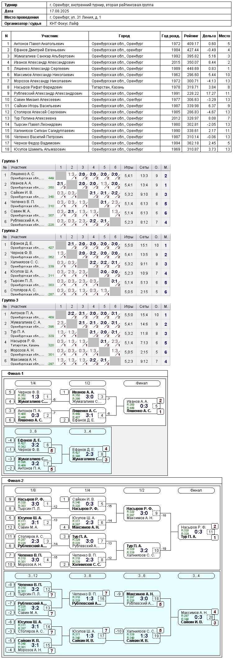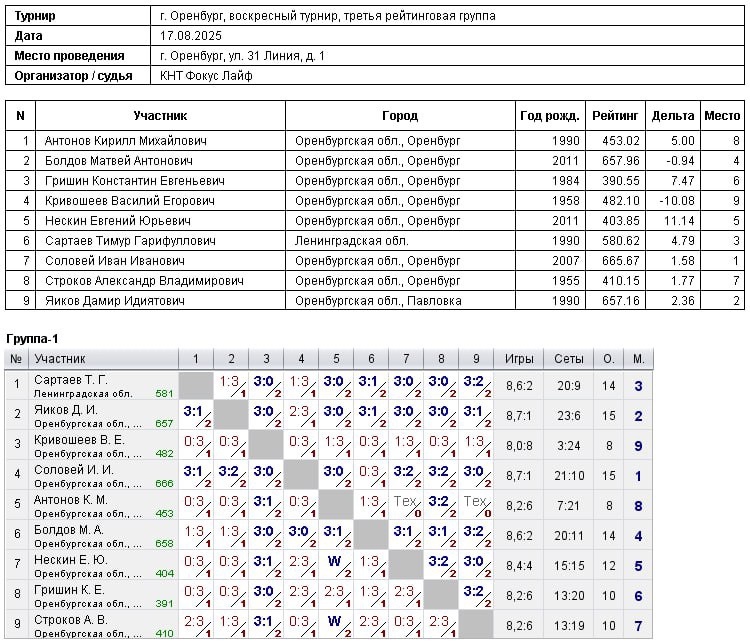 3 – Чернов Александр. В турнире игроков, рейтинг свыше 300, приняли участие 18 спортсменов. Победителями стали: