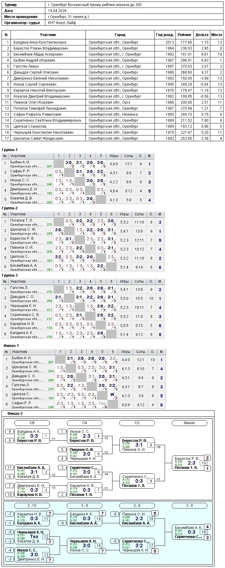 Сегодня в турнире игроков, рейтинг до 300, приняли участие 17 спортсменов.