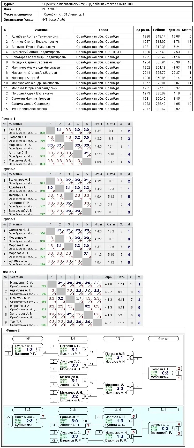 В турнире игроков, рейтинг свыше 300, приняли участие 15 спортсменов.