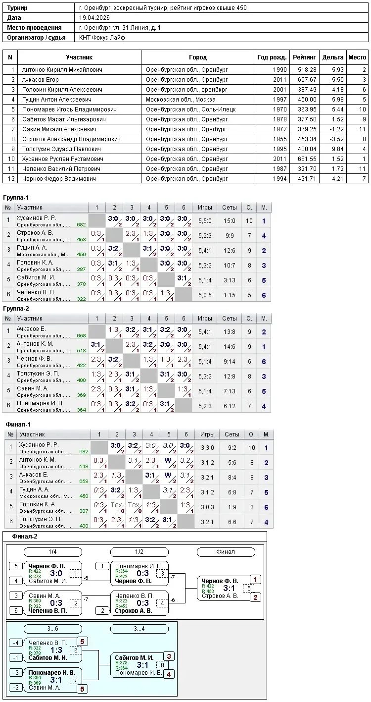 В турнире игроков, рейтинг свыше 450, приняли участие – 12 спортсменов.