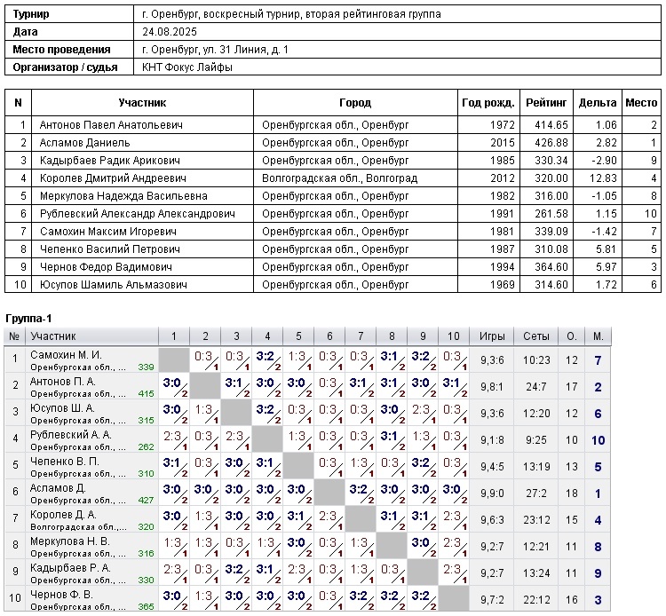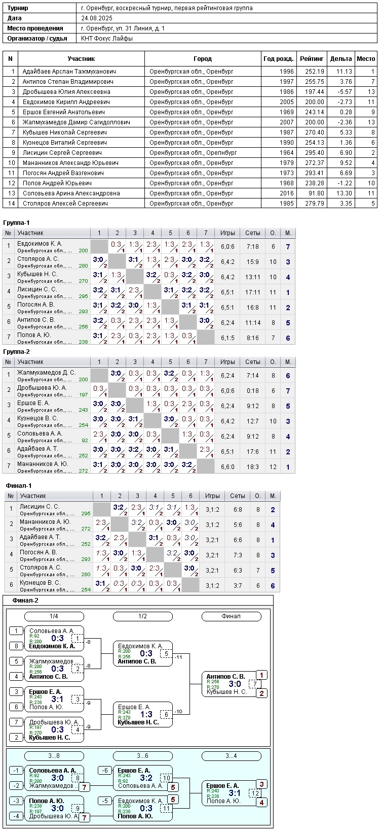 Воскресный турнир «Фокус Лайф» 24.08.2025