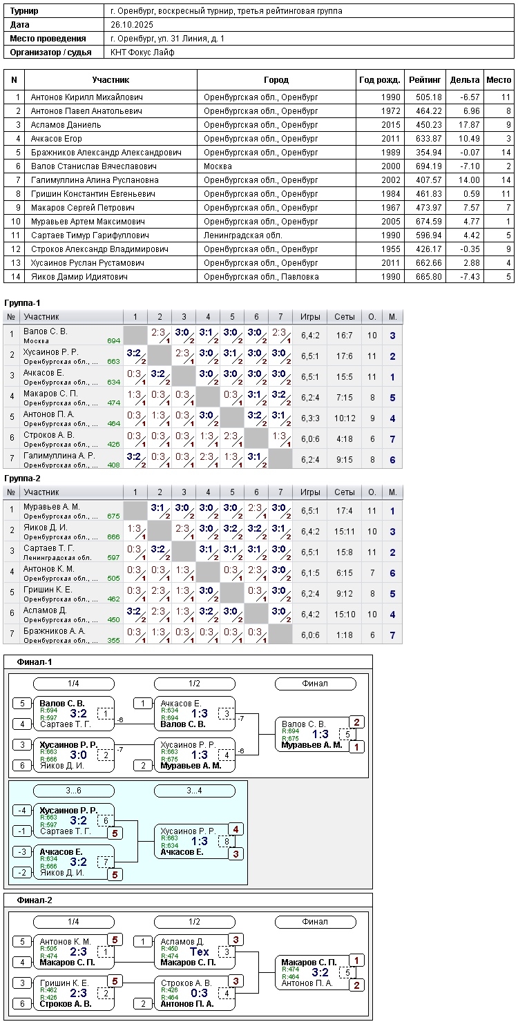 3 – Чернов Федор В турнире игроков, рейтинг свыше 450, приняли участие – 13 спортсменов. Победителями