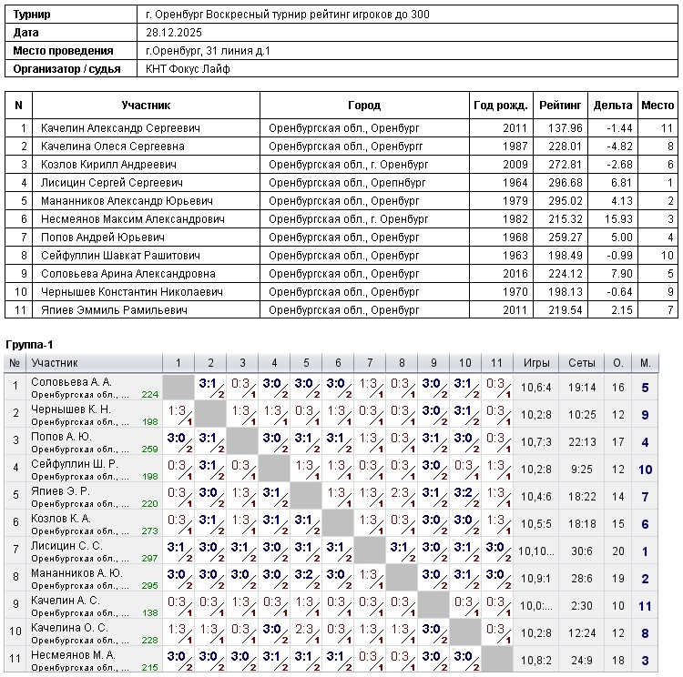 Сегодня в турнире игроков, рейтинг до 300, приняли участие 11 спортсменов.