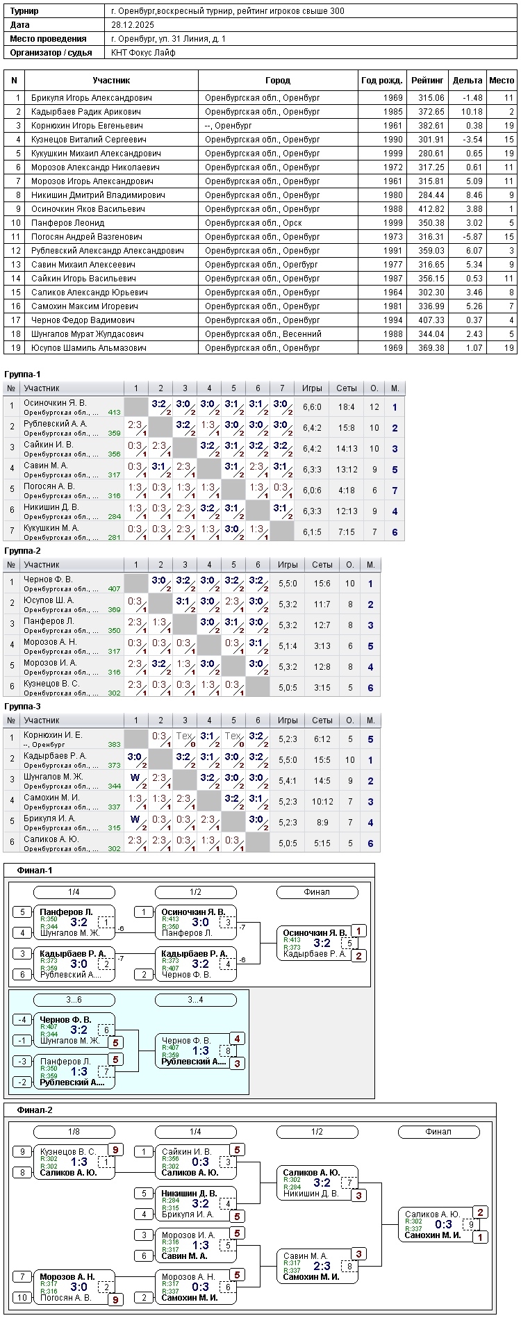 В турнире игроков, рейтинг свыше 300, приняли участие 19 спортсменов.